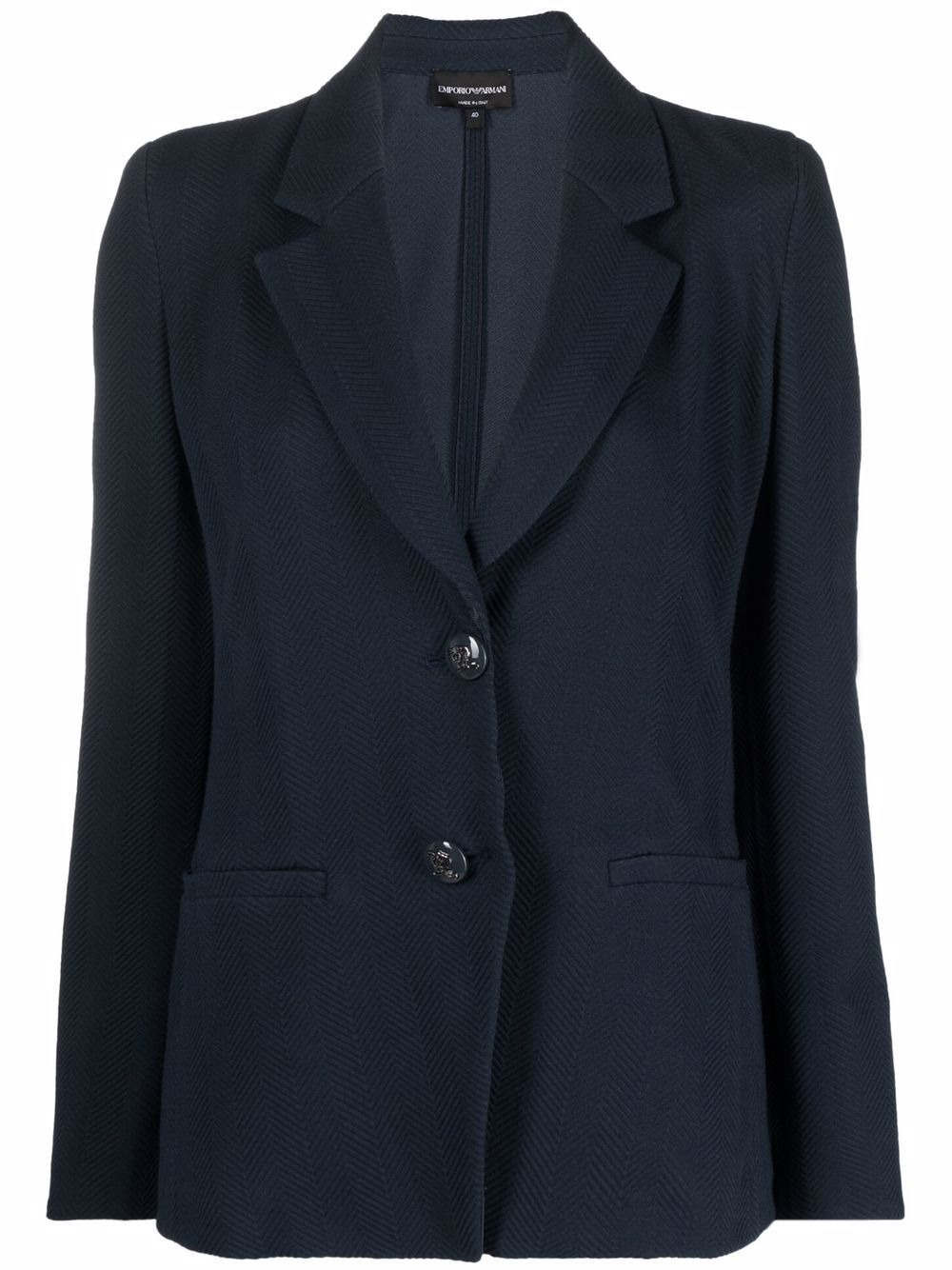 single-breasted twill jacket navy blue cotton blend notched lapels front button fastening long sleeves straight hem Made in Italy Composition Outer: Cotton 67%, Polyamide 28%, Elastane 5% Lining: Polyester 77%, Silk 18%, Polyamide 5% SIZE & FIT Model measurements Height 5 ft 9 in(1.75 m) Bust/Chest 34.64 in(88 cm) Hips 36.61 in(93 cm) Waist 26.37 in(67 cm) FittingInformation This piece fits true to size. We recommend you get your regular size Cut for a slim fit Made with a mid-weight fabric