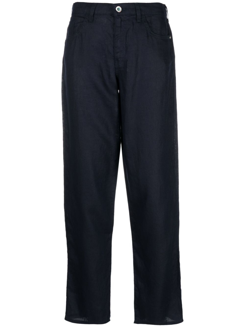 straight-leg linen trousers Highlights - Linen/flax - Wide leg - Logo patch to the rear - Belt loops - Front button and zip fastening - Classic five pockets - Navy blue Imported Composition Linen/Flax 100% SIZE & FIT Model measurements Height 5 ft 11 in(1.8 m) Bust/Chest 31.49 in(80 cm) Hips 36.41 in(92.5 cm) Waist 25.59 in(65 cm) FittingInformation Designed for a straight-leg fit, these trousers allow for a close fit at the waist and an unrestricted, comfortable fit over the leg Made from a lightweight non-stretch fabric This piece fits true to size – take your usual size