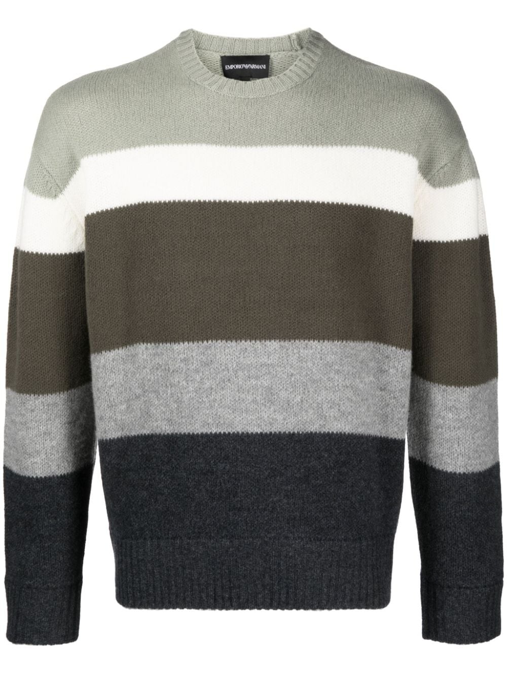 striped virgin wool jumper Highlights - Sage green/multicolour - Virgin wool - Intarsia knit - Horizontal stripe pattern - Crew neck - Long sleeves - Ribbed cuffs and hem Imported Composition Virgin Wool 100% SIZE & FIT Model measurements Height 6 ft 2 in(1.89 m) Bust/Chest 37.79 in(96 cm) Hips 37 in(94 cm) Waist 29.92 in(76 cm) FittingInformation Designed for a relaxed fit, this piece allows for comfort and movement when worn The ribbed hem offers a close, comfortable fit Made with a midweight knit, this piece offers some stretch This piece fits true to size – take your usual size Washing instructions Hand Wash