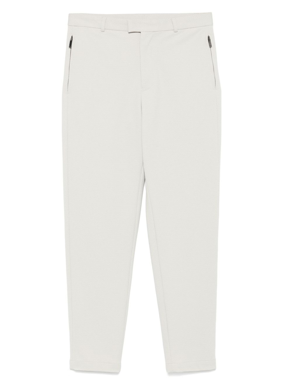 tapered trousers Highlights - Light grey - Concealed front button, hook and zip fastening - Belt loops - Two side zip-fastening pockets - Rear welt pocket Imported Composition Polyamide 97%, Elastane 3% SIZE & FIT Model measurements Height 6 ft 0 in(1.84 m) Bust/Chest 37.79 in(96 cm) Hips 37 in(94 cm) Waist 31.49 in(80 cm) FittingInformation Designed for a slim tapered leg, offering a close fit that sits just away from the leg with a closer fit towards the ankle Made from a midweight stretch fabric, this piece offers elasticity and flexibility when worn
