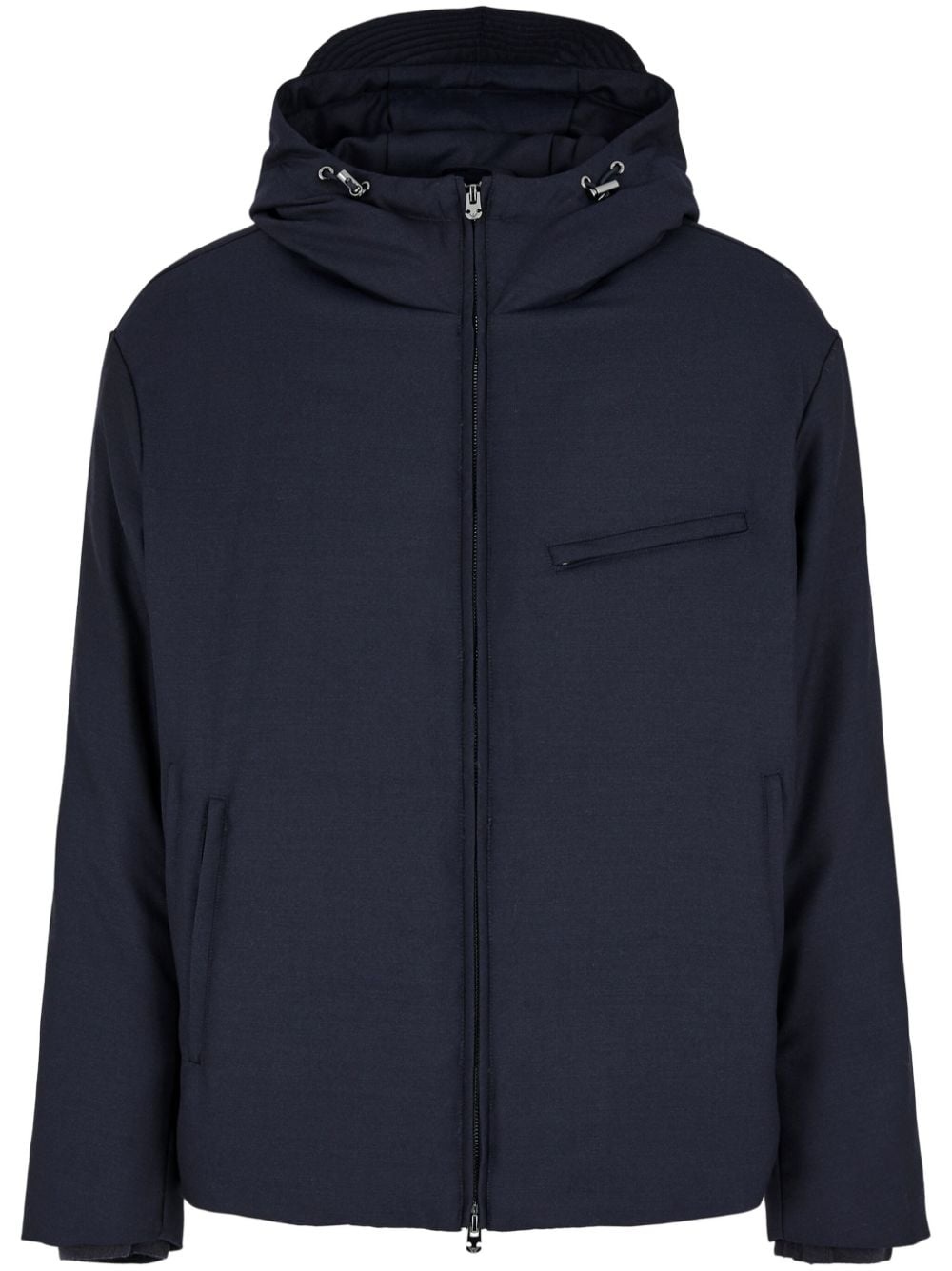 Travel Essentials hooded jacket Highlights - Navy blue - Virgin wool blend - Water-resistant - Logo patch to the rear - Drawstring hood - Front two-way zip fastening - Long sleeves - Multiple zip-fastening pockets - Straight hem - Full lining Imported Composition Virgin Wool 70%, Polyester 30%