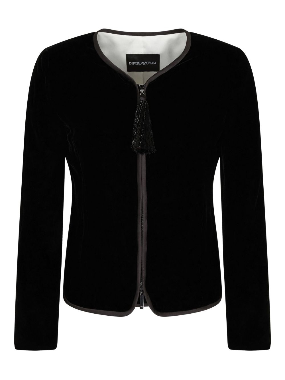 velvet tassel-embellished jacket Highlights - Black - Velvet texture - Front zip fastening - Satin trim - Tassel pull - Cropped sleeves Imported Composition Fabric 100% Washing instructions Read Manufacturer Guidelines