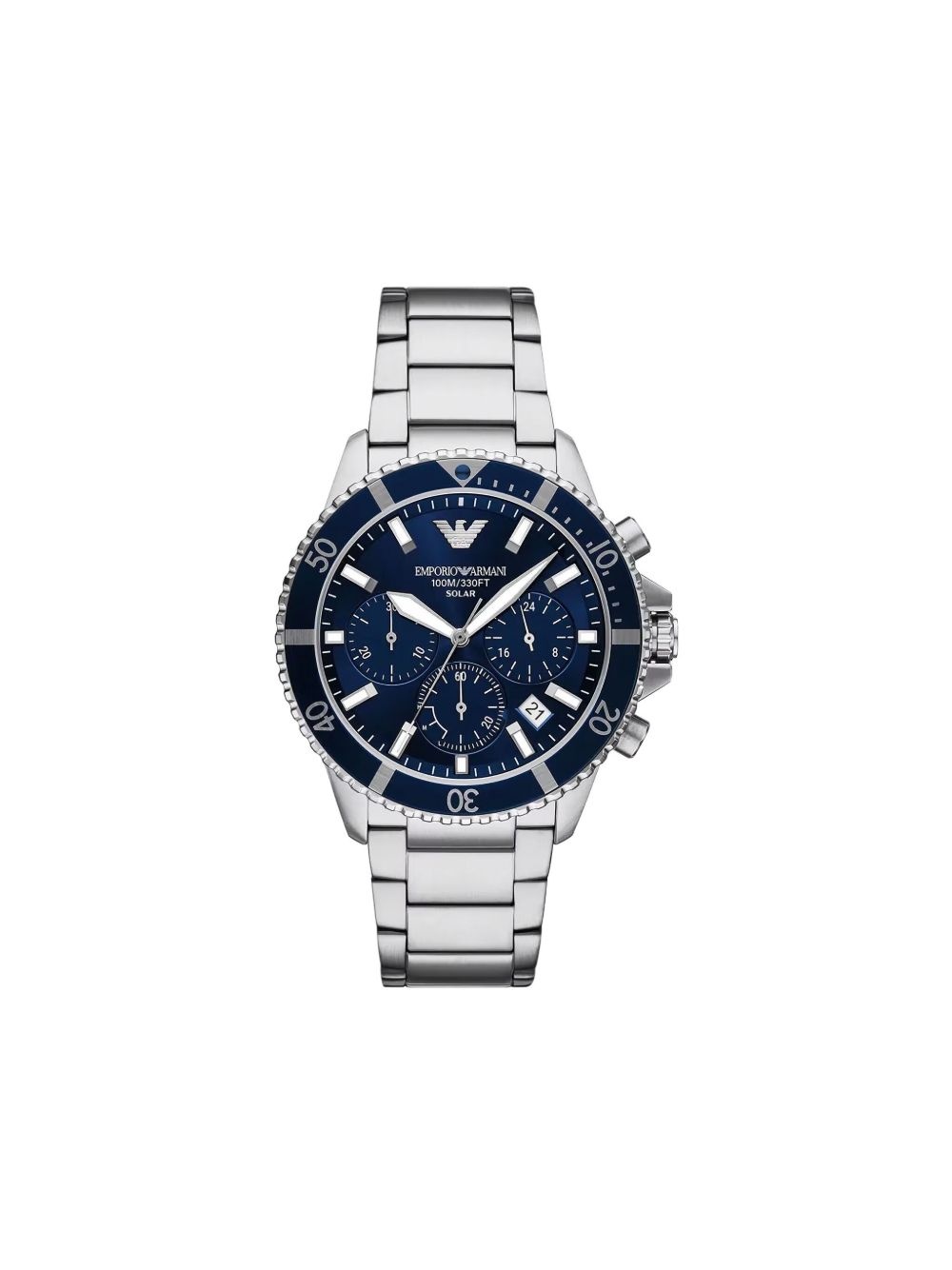 World Explorer 43.5mm Highlights - 43.5mm - Stainless steel case - Solar-powered movement - Round face - Navy blue - Baton dial - Three chronograph sub-dials - Sword hands - Sweeping second hand - Rotating bezel - Two chronograph pushers - Stainless steel link bracelet - Folding clasp - Water resistance up to 100m/10 atm - This item comes with a standard two-year warranty from the brand. Imported Composition stainless steel 100% SIZE & FIT Measurement DIAMETER 1.71 in(4.3 cm)