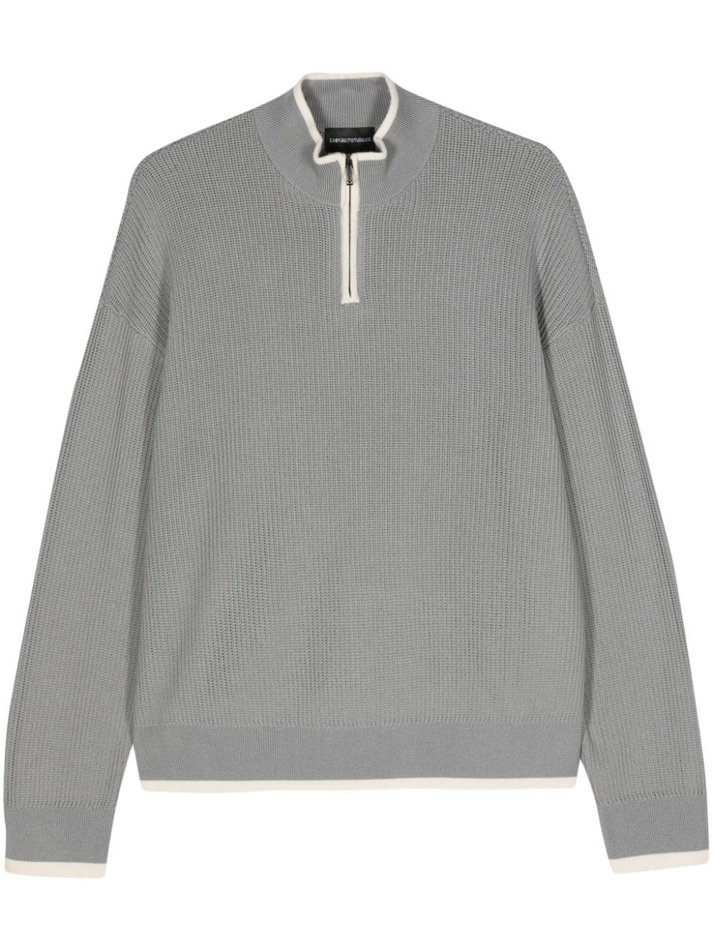 zip-up jumper Highlights - Cool grey - Cotton-virgin wool blend - Ribbed knit - Contrasting trim - Stand-up collar - Drop shoulder - Long sleeves - Unlined - Straight hem - Short front zip fastening Imported Composition Virgin Wool 68%, Cotton 32%