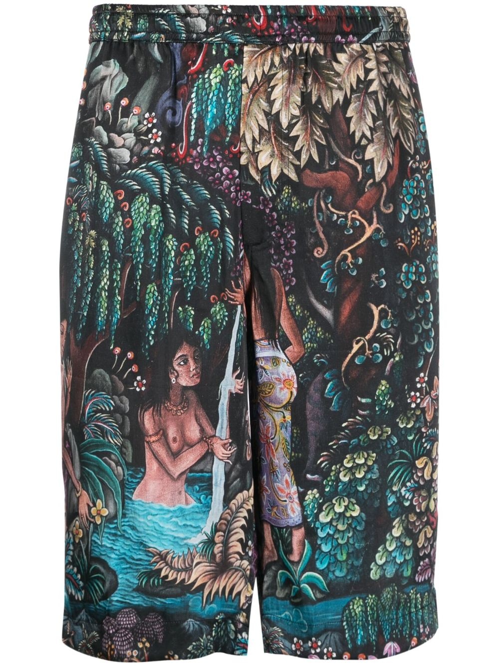 Goa Gajah silk bermuda shorts Highlights - Black/multicolour - Silk - All-over graphic print - Elasticated waistband - Two side slash pockets - Two rear welt pockets - Knee-length Imported Composition Silk 100% SIZE & FIT Model measurements Height 6 ft 2 in(1.87 m) Bust/Chest 36.41 in(92.5 cm) Hips 37 in(94 cm) Waist 29.52 in(75 cm) FittingInformation Designed for relaxed fit, offering a comfortable loose fit over the leg The elasticated waist allows for a comfortable fit Made from a midweight non-stretch fabric This piece fits true to size – take your usual size