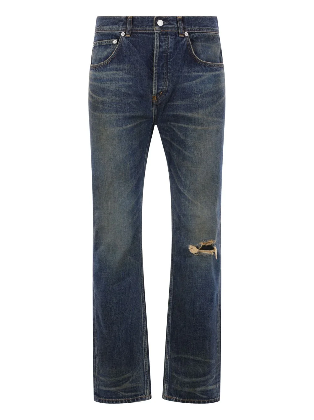 distressed logo-patch jeans Highlights - Blue - Distressed effect - Belt loops - Side pockets - Logo patch Imported Composition Cotton 100% Washing instructions Machine Wash