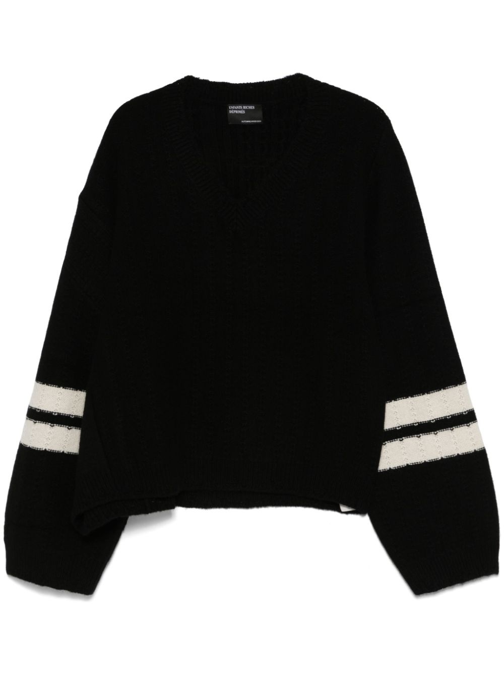 striped asymmetric sweater Highlights - Black - Ribbed cuffs and hem - V-neck - Long sleeves Made in Italy Composition Cashmere 100% SIZE & FIT Model measurements Height 6 ft 0 in(1.84 m) Bust/Chest 35.82 in(91 cm) Hips 37 in(94 cm) Waist 28.34 in(72 cm) FittingInformation Designed to be unstructured, offering a loose fit throughout Made with a midweight knit, this piece offers some stretch