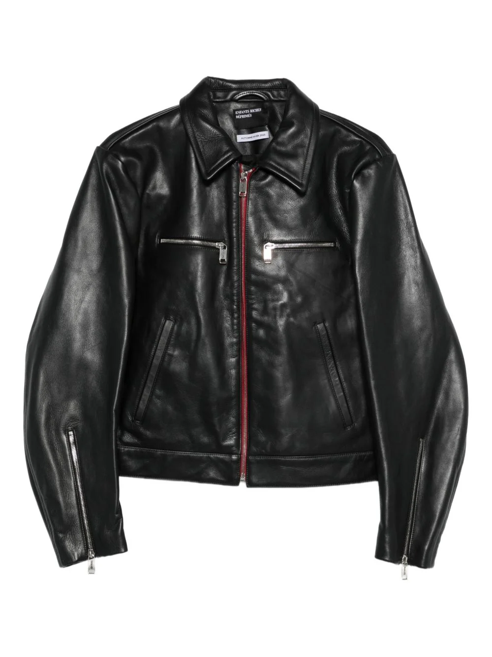zip-up leather biker jacket Highlights - Black - Red trims - Front zip fastening - Side pockets - Zip details to sleeves - Classic collar Made in Italy Composition Outer: Calf Leather 100% Lining: Viscose 100% SIZE & FIT Model measurements Height 6 ft 1 in(1.85 m) Bust/Chest 35.82 in(91 cm) Hips 37.79 in(96 cm) Waist 29.13 in(74 cm) Washing instructions Dry Clean Only