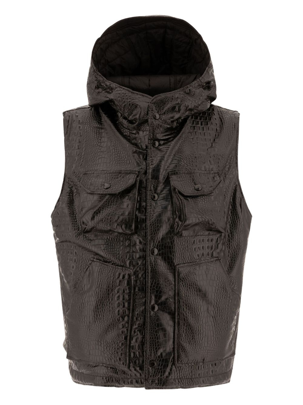 hooded crocodile-effect vest Highlights - Black - Crocodile-effect pattern - Snap-button closure - Flap pockets - Hooded neckline - Sleeveless Made in United States Composition Polyurethane 60%, Polyester 40% Washing instructions Read Manufacturer Guidelines