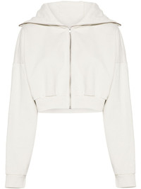 cropped zipped hoodie Highlights - Chalk white - Organic cotton - Jersey texture - Classic hood - Drop shoulder - Long sleeves - Ribbed cuffs and hem - Internal logo tag - Fleece lining - Cropped - Front zip fastening Imported Composition Organic Cotton 100% SIZE & FIT Model measurements Height 5 ft 10 in(1.77 m) Bust/Chest 33.85 in(86 cm) Hips 37 in(94 cm) Waist 26.37 in(67 cm) FittingInformation Designed to be unstructured, offering a loose fit throughout Made from a midweight non-stretch fabric, this piece offers minimal elasticity when worn This piece fits true to size – take your usual size