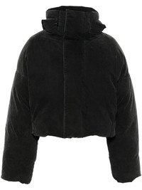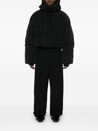 hooded puffer jacket Highlights - Black - Cotton - Twill weave - Faded effect - Padded design - Duck down-feather filling - Drawstring hood - Concealed front zip fastening - Front touch-strap fastening - Funnel neck - Drop shoulder - Extra-long sleeves with ribbed cuffs - Internal zip-fastening pocket - Full lining - Straight hem - When buying this unisex item, keep in mind that it is graded in standard men's sizing. Imported Composition Lining: Cotton 100%, Duck Down 90%, Duck Feathers 10% Outer: Cotton 100% SIZE & FIT Model measurements Height 5 ft 10 in(1.78 m) Bust/Chest 31.49 in(80 cm) Hips 37 in(94 cm) Waist 23.62 in(60 cm) Measurement SLEEVE LENGTH 22.44 in(57 cm) LENGTH 22.83 in(58 cm) WAIST 55.11 in(140 cm) BUST 55.9 in(142 cm) Shoulder Width 31.1 in(79 cm) FittingInformation This piece is unisex – if you usually select men's sizing expect a loose fit throughout; if you usually select women's sizes, expect an oversized fit Made from a padded non-stretch fabric, giving it no natural elasticity Washing instructions Hand Wash
