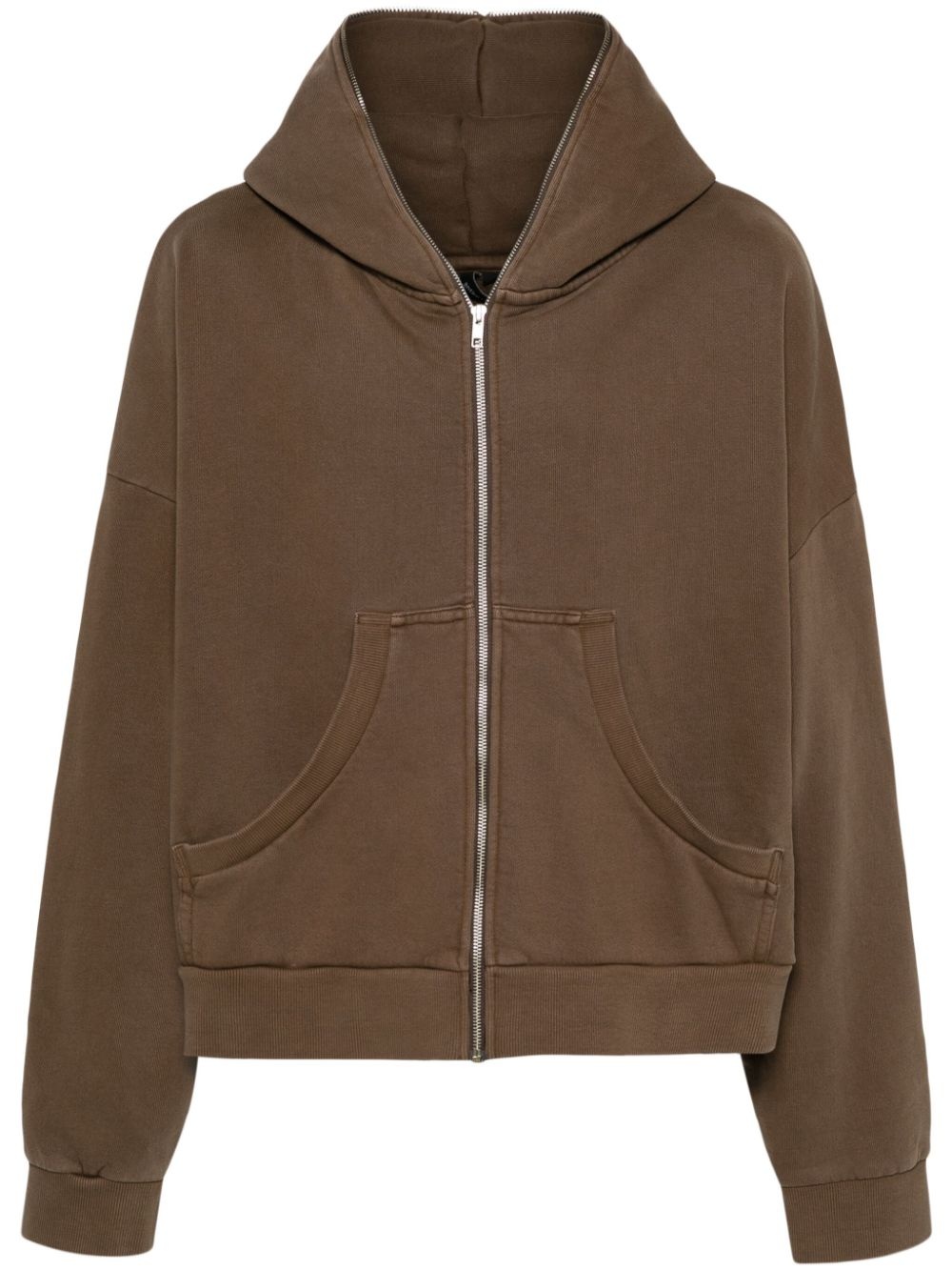 organic-cotton zipped hoodie Highlights - Brown - Organic cotton - Jersey texture - Classic hood - Drop shoulder - Long sleeves - Ribbed cuffs and hem - Two front pouch pockets - Front zip fastening - Straight hem - Fleece lining - When buying this unisex item, keep in mind that it is graded in standard men's sizing. Imported Composition Organic Cotton 100% SIZE & FIT Model measurements Height 5 ft 11 in(1.8 m) Bust/Chest 33.07 in(84 cm) Hips 37 in(94 cm) Waist 25.59 in(65 cm) Measurement CHEST 62.99 in(160 cm) SLEEVE LENGTH 37.4 in(95 cm) LENGTH 24.4 in(62 cm) Shoulder Width 30.7 in(78 cm) FittingInformation This piece is unisex – if you usually select men's sizing expect a loose fit throughout; if you usually select women's sizes, expect an oversized fit Made from a midweight non-stretch fabric, this piece offers minimal elasticity when worn Washing instructions Machine Wash