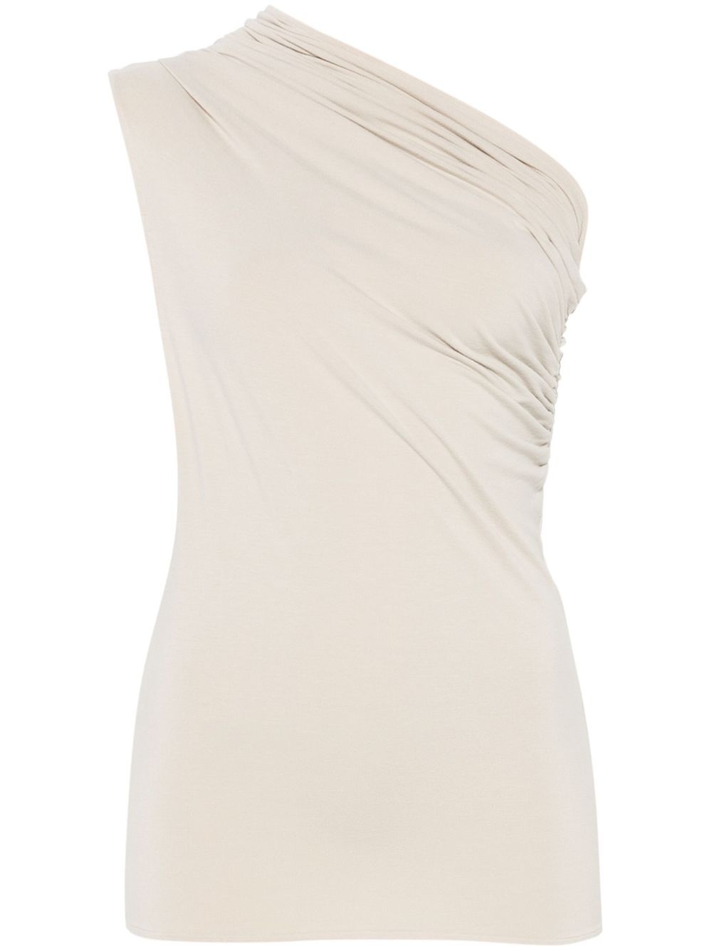 Pillar top Highlights - Sand beige - Stretch-design - One-shoulder - Draped detailing - Gathered detailing - No lining - Straight hem Made in United Kingdom Composition Viscose 92%, Spandex/Elastane 8% SIZE & FIT Model measurements Height 5 ft 11 in(1.8 m) Bust/Chest 33.07 in(84 cm) Hips 37.4 in(95 cm) Waist 25.19 in(64 cm) FittingInformation Designed for a slim fit that sits just away from the body offering a close yet comfortable fit Made from a midweight stretch fabric, this piece offers elasticity and flexibility when worn