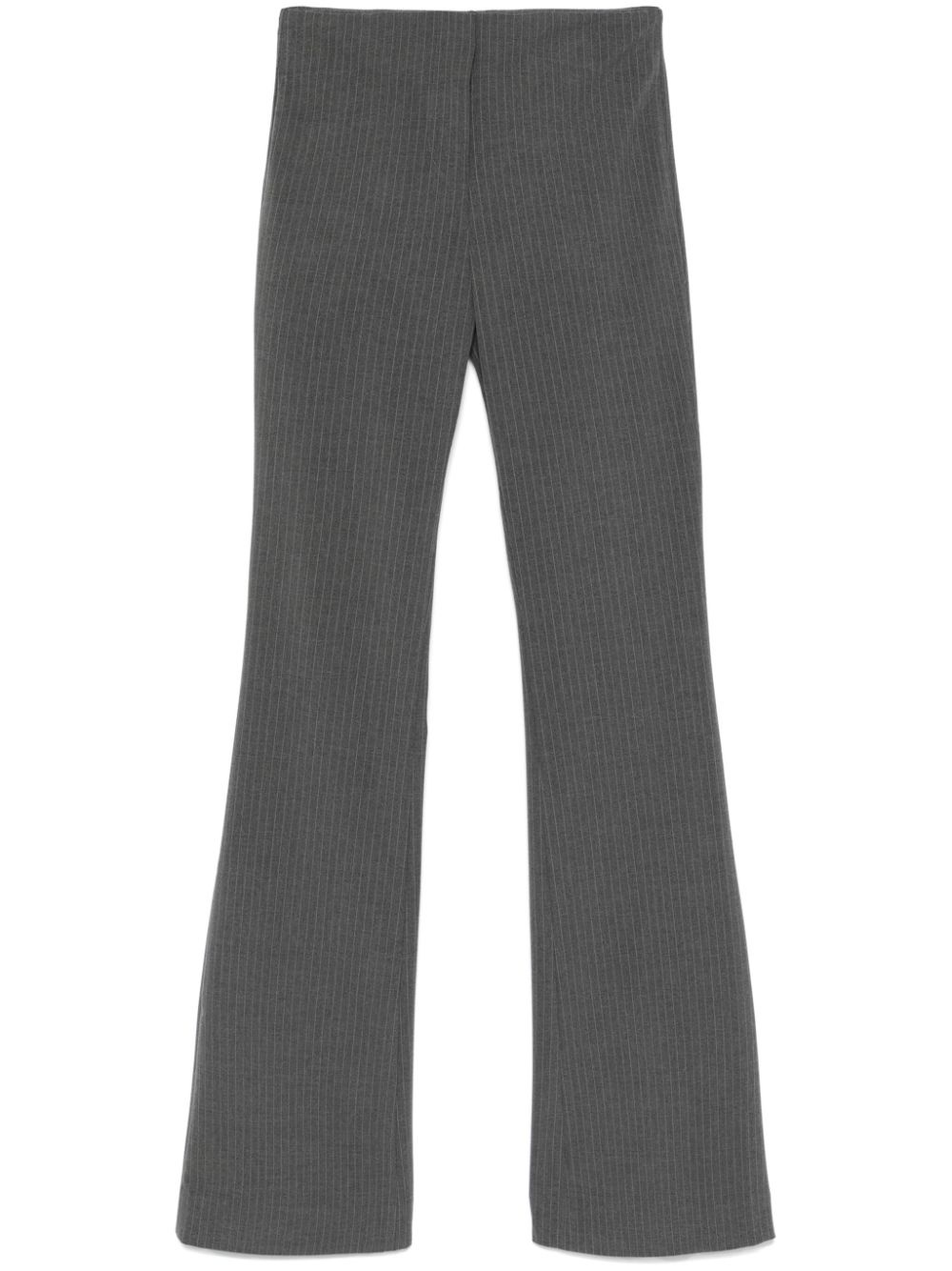 pinstriped flared trousers Highlights - Ash grey - Concealed front button, hook and zip fastening - Two rear welt pockets Imported Composition Polyester 96%, Elastane 4% SIZE & FIT Model measurements Height 5 ft 10 in(1.77 m) Bust/Chest 34.64 in(88 cm) Hips 35.43 in(90 cm) Waist 24.8 in(63 cm) FittingInformation Designed with a bootcut leg, these trousers allow for a close fit at the waist and with an unrestricted, comfortable fit and additional room at the calves Made from a midweight stretch fabric, this piece offers elasticity and flexibility when worn