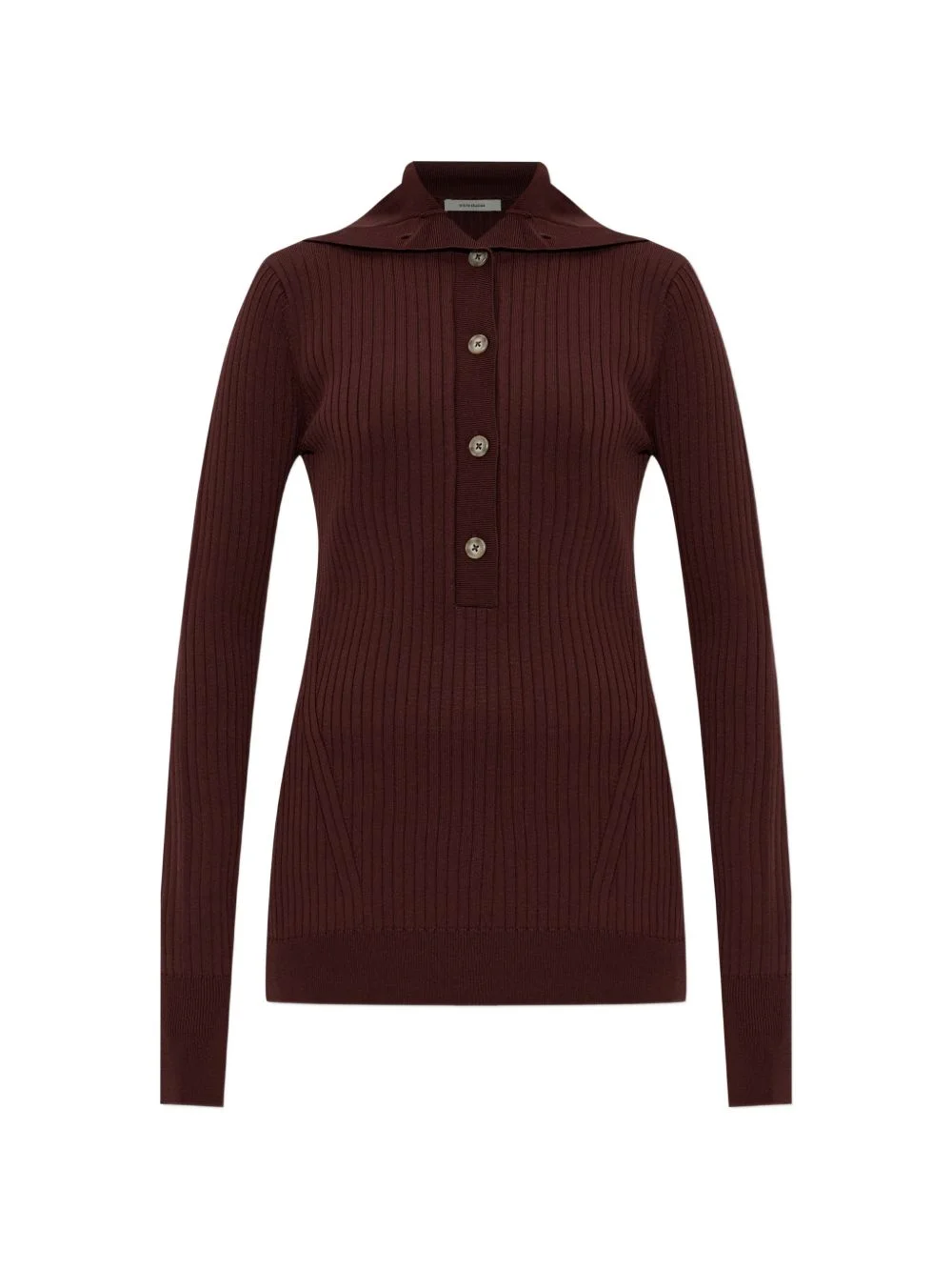 ribbed-buttoned polo Highlights - Brown - Ribbed knit - Button closure - Long sleeves - Collared Imported Composition Viscose 65%, Polyamide 35% Washing instructions Read Manufacturer Guidelines