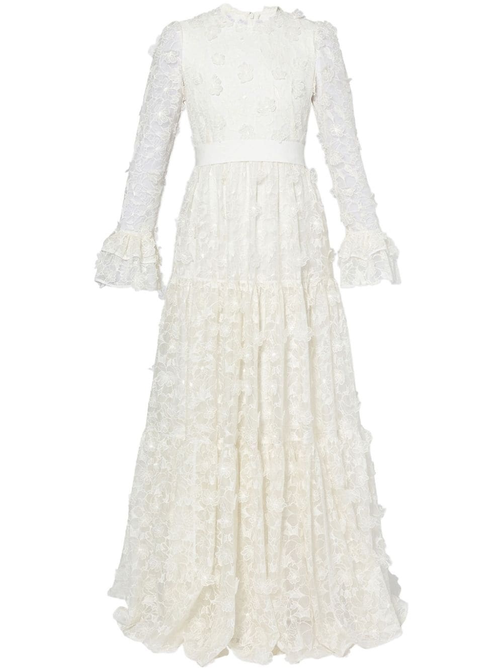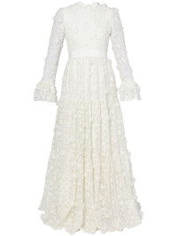 Alvaro floral-cutwork silk-organza gown Highlights - Ivory white - Silk - Organza - 3d detailing - Cutwork detailing - Round neck - Long sleeves - Ruffle cuffs - Grosgrain ribbon trim - Full skirt - Full-length - Partial lining Made in United Kingdom Composition Outer: Silk 100% Lining: Acetate 71%, Viscose 29% SIZE & FIT FittingInformation Designed for a close fit at the chest and waist with a loose fit at the hip