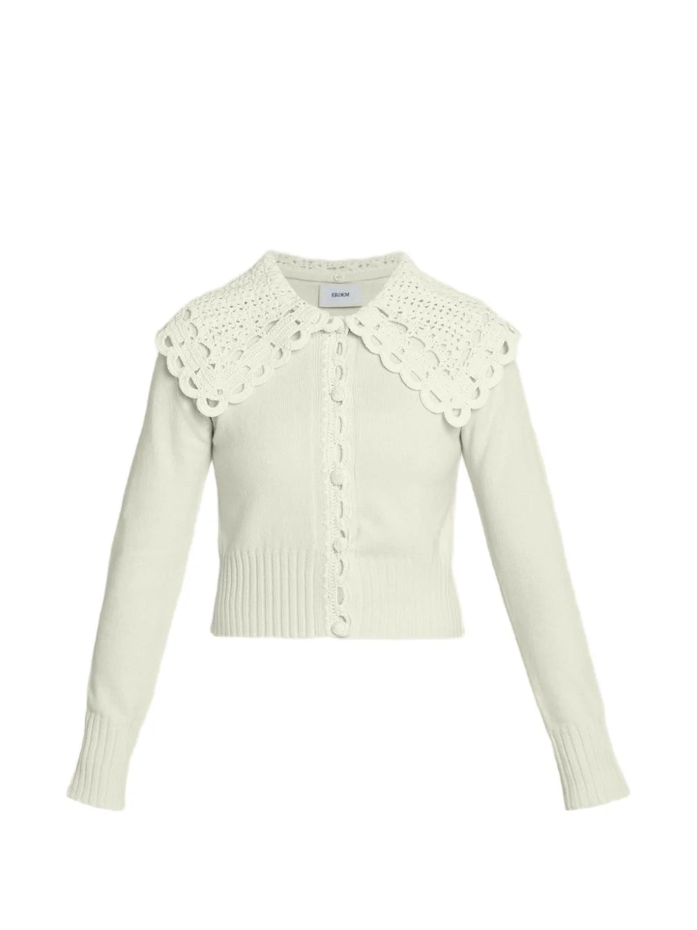crochet-collar cardigan Highlights - Alabaster - Button fastening - Crew neck - Ribbed detailing Imported Composition Wool 55%, Recycled Nylon 25%, pure cotton 20% Outer: Organic Cotton 100% Washing instructions Dry Clean Only