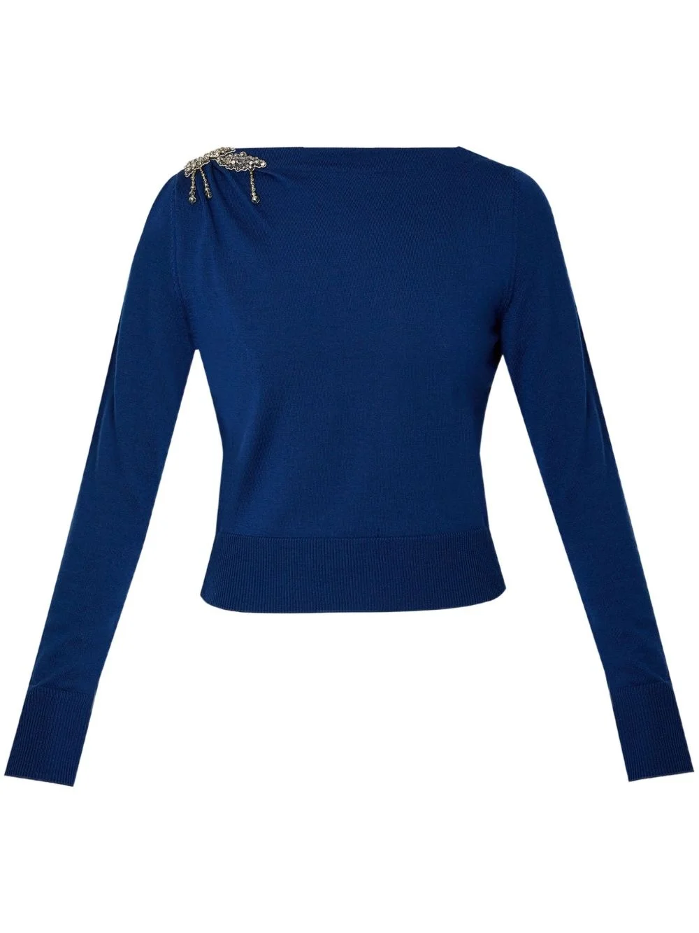 cropped sweater Highlights - Cerulean blue - Ribbed cuffs and hem - Applique detail - Crystal embellishment Imported Composition Merino 100%, glass 70%, Brass 20%, Metal 5%, Polyester 5% Washing instructions Dry Clean Only