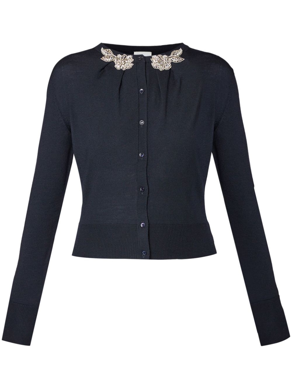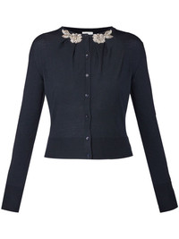 draped-detail cardigan Highlights - Navy blue - Wool - Fine knit - Glass crystal embellishment - Pleat detailing - Crew neck - Long sleeves - Ribbed edge - Straight hem Imported Composition Wool 100%, glass 60%, Copper 20%, Brass 20% SIZE & FIT FittingInformation Designed for a slim fit that sits just away from the body offering a close yet comfortable fit