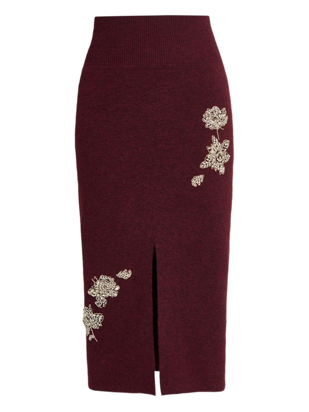 embellished midi skirt Highlights - Burgundy - High waist - Floral embellishment - Beaded details Imported Composition Outer: Polyamide 59%, Viscose 23%, Merino 10%, Cashmere 5%, Elastane 3% Lining: glass 55%, Brass 40%, Nylon 5% Washing instructions Read Manufacturer Guidelines