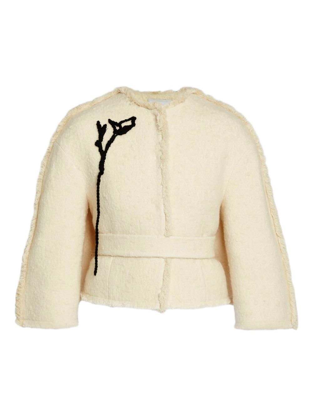 floral-embellished belted jacket Highlights - Ivory - Frayed edges - Belted waist - Cocoon shape - Floral embellishment Made in United Kingdom Composition Outer: Cotton 59%, Wool 37%, Polyamide 4% Lining: Silk 100% Washing instructions Dry Clean Only