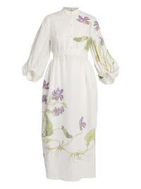 floral-print midi dress Highlights - White - Stand-up collar - Front button fastening - Three-quarter length sleeves - Front tie fastening - Two side slit pockets - Unlined - Mid-length Imported Composition Linen/Flax 100%