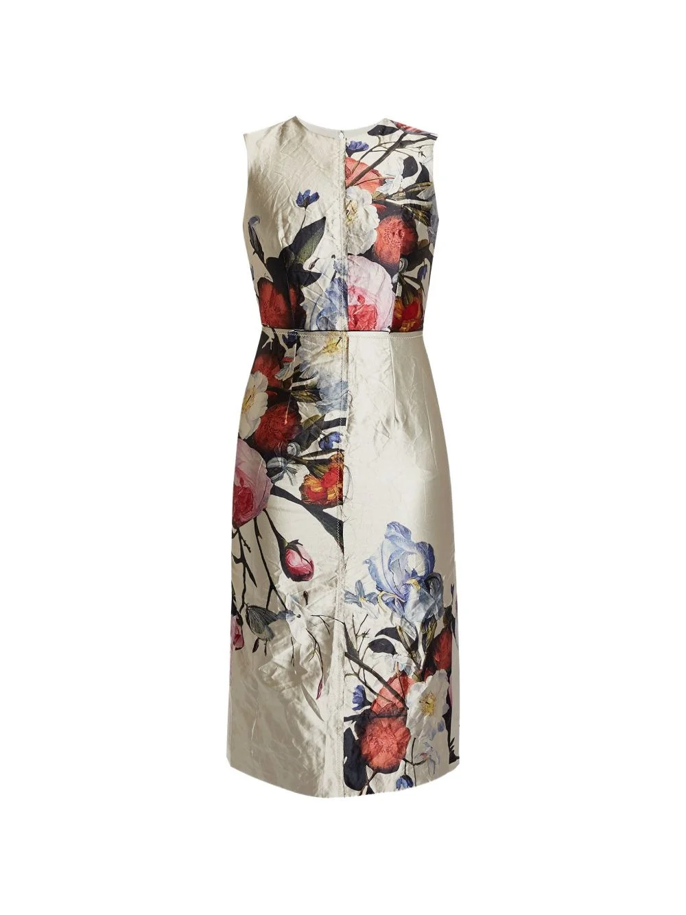 FLORAL PRINT TEXTURED SATIN SLEEVELESS MIDI DRESS