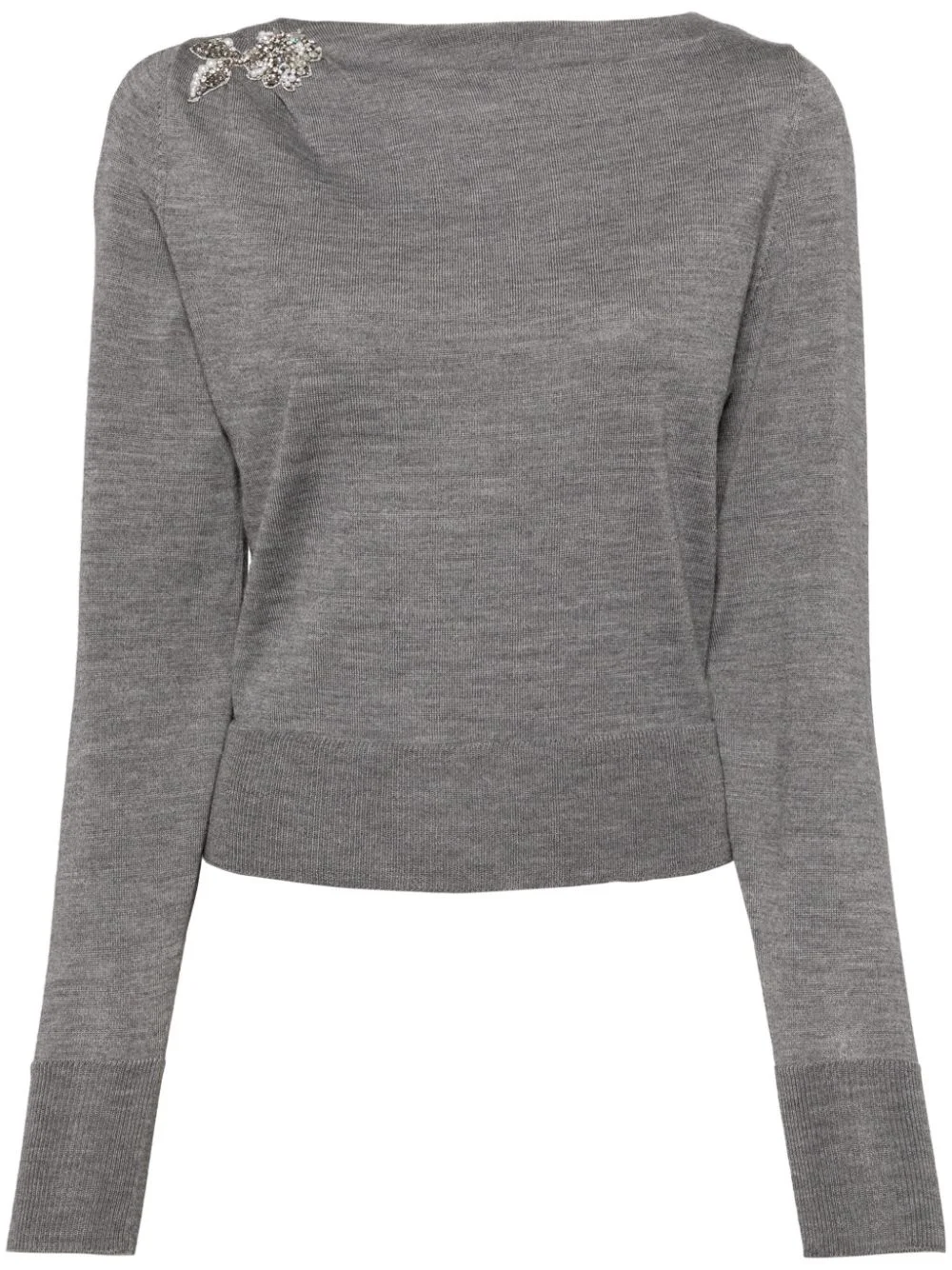 glass crystal embellishment wool knitted top Highlights - Light grey - Wool - Knitted construction - Cut-out detailing - Glass crystal embellishment - Crew neck - Long sleeves - Ribbed cuffs and hem - Straight hem Imported Composition Wool 100% SIZE & FIT Model measurements Height 5 ft 10 in(1.77 m) Bust/Chest 27.95 in(71 cm) Hips 34.64 in(88 cm) Waist 22.83 in(58 cm) Measurement SLEEVE LENGTH 25.19 in(64 cm) LENGTH 18.5 in(47 cm) BUST 33.85 in(86 cm) Shoulder Width 12.59 in(32 cm) FittingInformation Designed for a slim fit that sits just away from the body offering a close yet comfortable fit Made with a midweight knit, this piece offers some stretch