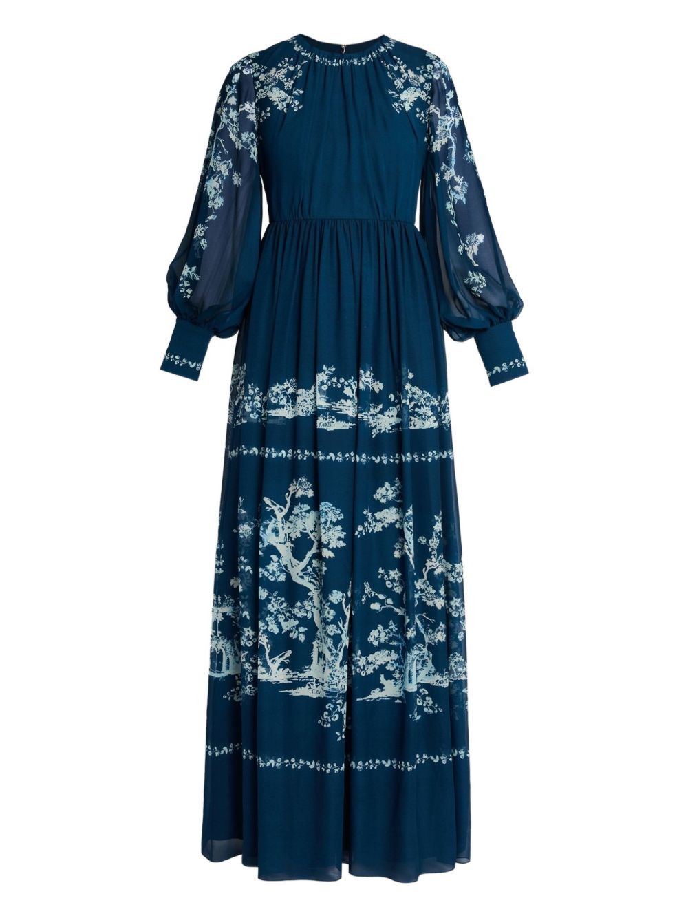 long-sleeve print gown Highlights - Navy blue - Long sleeves - Bishop sleeves - Round neck - Gathered waist Imported Composition Outer: Silk 100% Lining: Acetate 73%, Silk 27% Washing instructions Dry Clean Only