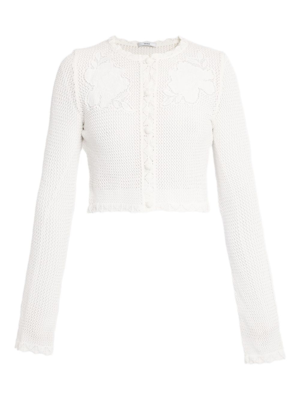 long-sleeved cardigan Highlights - White - Front button fastening - Round neck - Floral applique - Scallop hem Imported Composition Organic Cotton 100%, Polyester 60%, Cotton 40%