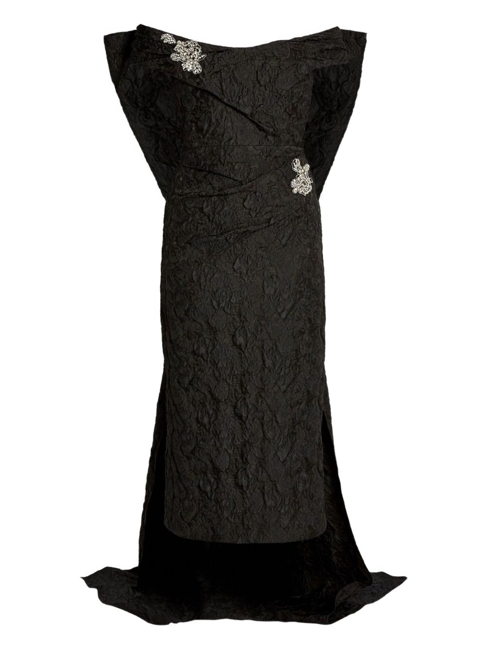 off-shoulder midi dress Highlights Made in United Kingdom Composition Outer: Polyester 83%, Brass 40%, glass 20%, Metal (Other) 20%, Fabric 20%, Polyamide 17% Lining: Silk 100%