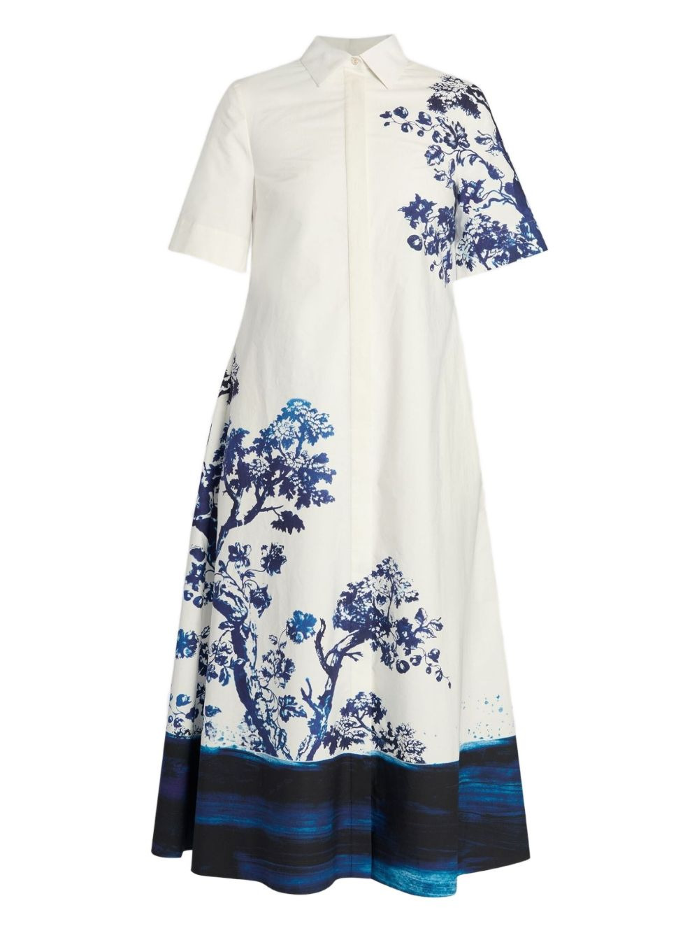short-sleeve floral-print midi dress Highlights - White and blue - Short sleeves - Collared neckline - Concealed button fastening - Concealed seam pockets Imported Composition Organic Cotton 100% Washing instructions Dry Clean Only