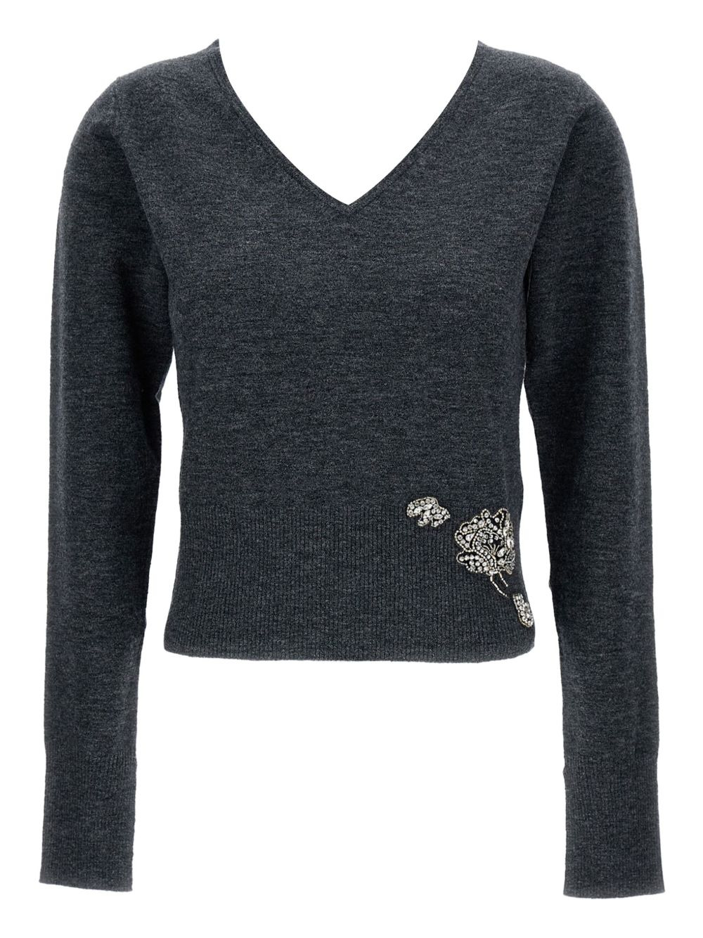 V-neck embellished sweater Highlights Imported Composition Polyester 59%, Viscose 23%, Virgin Wool 10%, Wool 5%, Spandex/Elastane 3%