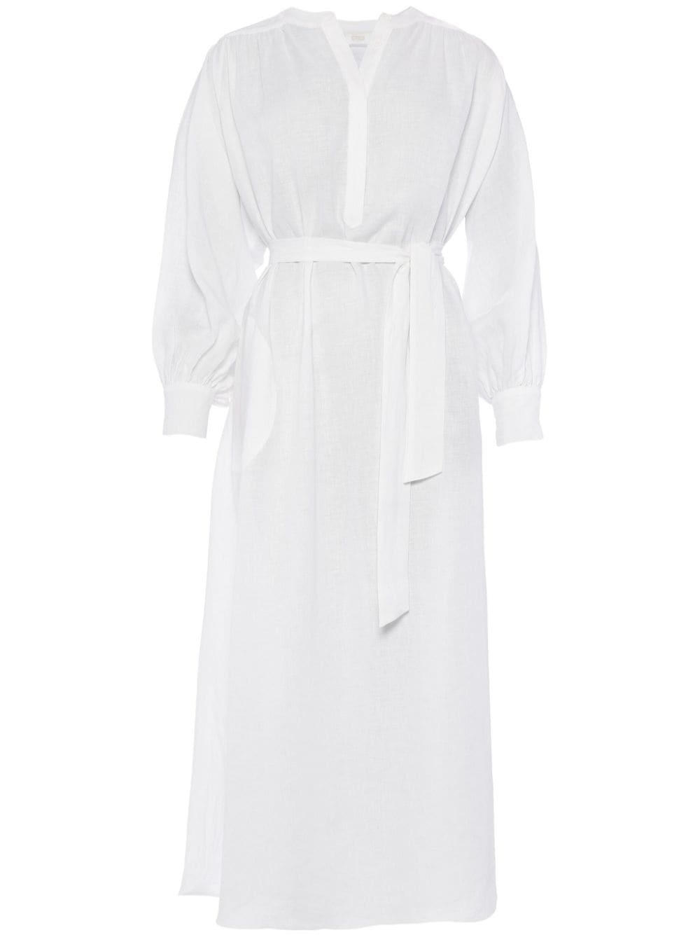 Aimee linen maxi dress Highlights - White - Linen/flax - Shift style - Gathered detailing - Round neck - Concealed front button fastening - Long sleeves - Buttoned cuffs - Detachable waist belt - Straight hem - Maxi Imported Composition Linen/Flax 100% SIZE & FIT FittingInformation Designed to be unstructured, offering a loose fit throughout The adjustable tie waist gives a more adaptable and personalised fit Made from a lightweight non-stretch fabric This piece fits true to size – take your usual size