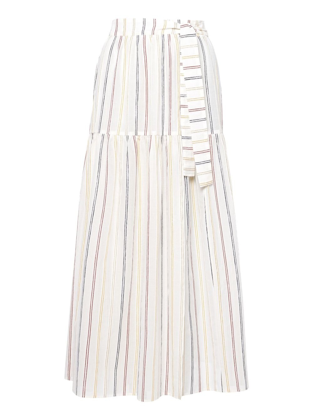 Brillante striped tiered maxi skirt Highlights - White - Multi-striped pattern - Elasticated waistband - Detachable tie belt - Tiered design - Side slit detailing Imported Composition Organic Cotton 58%, Cotton 27%, Viscose 10%, Polyamide 3%, Metallic Fibre 2% Washing instructions Machine Wash