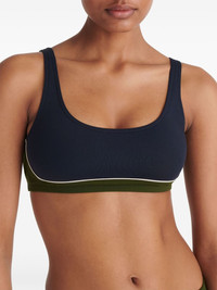 Finale scoop-neck bikini top Highlights - Navy blue/dark green - Stretch-design - Scoop neck - Rear clasp fastening - Sleeveless - Straight hem - Be mindful to try on swimwear over your own garments. Made in France Composition Polyamide 77%, Spandex/Elastane 23% SIZE & FIT FittingInformation This piece fits small – take one size up Washing instructions Machine Wash