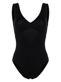 Hold Up V-neck swimsuit Highlights - Black - Stretch-design - Open back - V-neck - Wide shoulder straps - Finished edge - Be mindful to try on swimwear over your own garments. Made in France Composition Polyamide 84%, Spandex/Elastane 16% SIZE & FIT FittingInformation Designed to offer medium brief coverage This piece fits small – take one size up Washing instructions Machine Wash