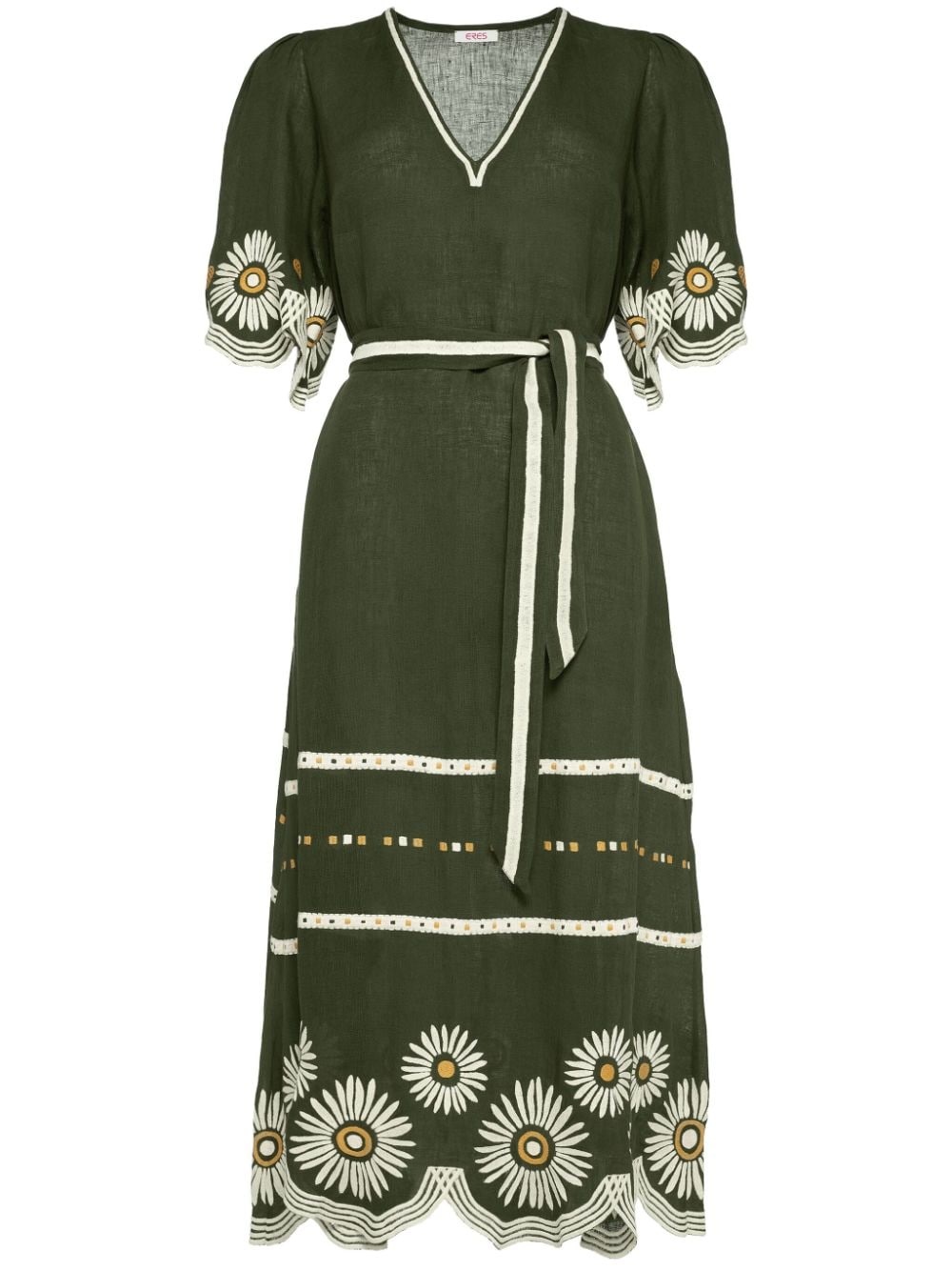 Hortense floral-embroidered linen dress Highlights - Olive green - Linen - Floral embroidery - V-neck - Short sleeves - Tied waist - A-line skirt - Mid-length - Scallop hem Imported Composition Linen/Flax 100%