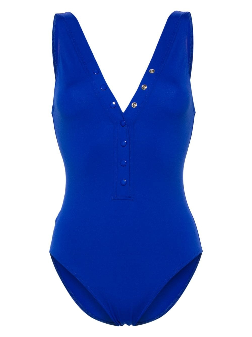 Icone V-neck swimsuit Highlights - Cobalt blue - Stretch-design - V-neck - Front press-stud fastening - Wide shoulder straps - Scoop back - Finished edge - Be mindful to try on swimwear over your own garments. Made in France Composition Polyamide 84%, Spandex/Elastane 16% SIZE & FIT FittingInformation Designed to offer medium brief coverage This piece fits small – take one size up Washing instructions Machine Wash