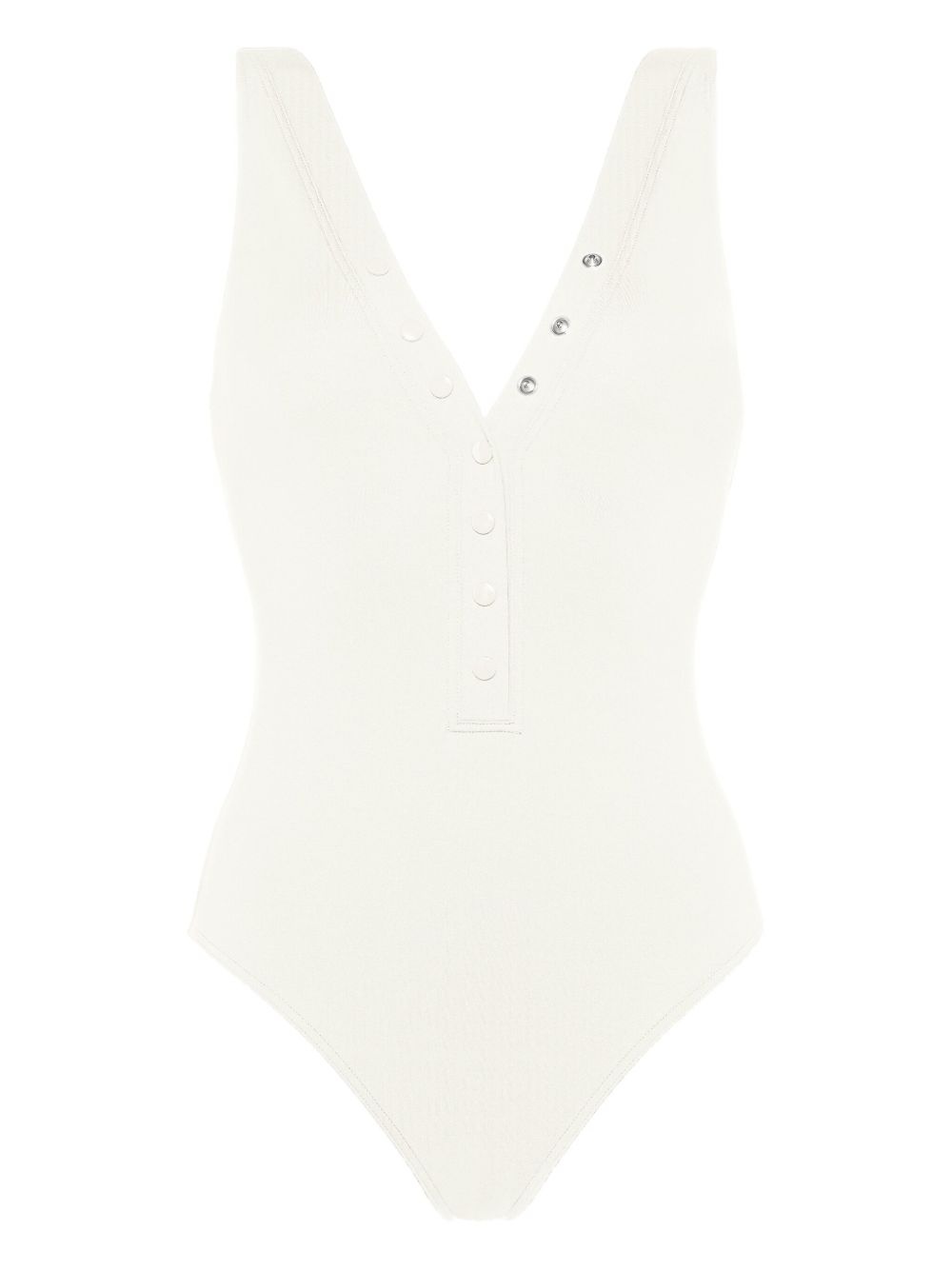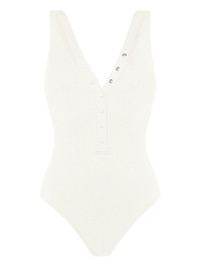 Icone ribbed snap-detail swimsuit Highlights - White - Deep v-neckline - Press-stud placket - Wide shoulder straps - Be mindful to try on swimwear over your own garments. Made in France Composition Polyamide 84%, Spandex/Elastane 16%