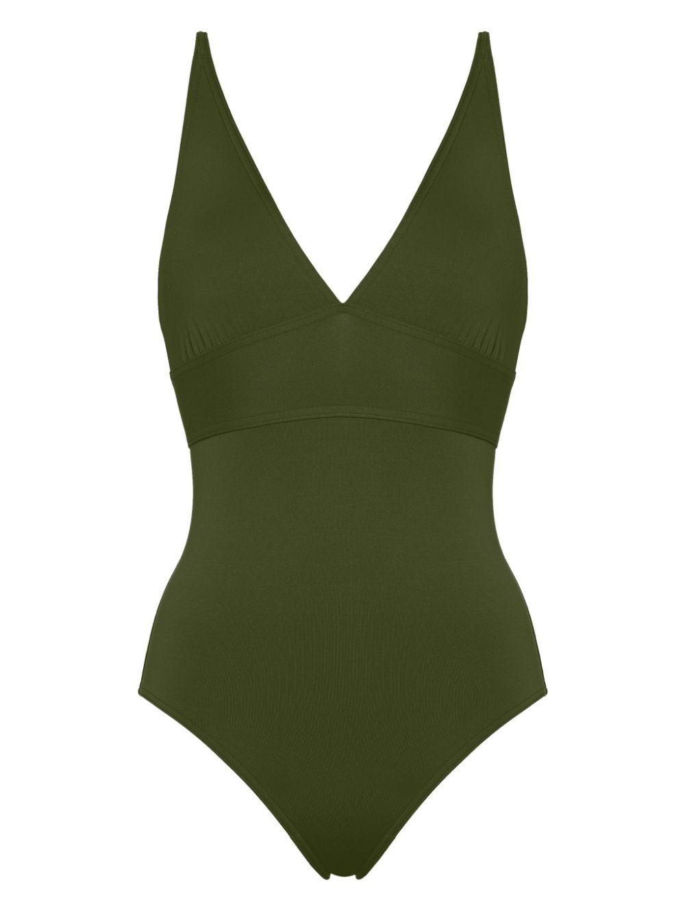 Larcin V-neck swimsuit Highlights - Green - Stretch-design - V-neck - Square open back - Sleeveless - Be mindful to try on swimwear over your own garments. Made in France Composition Polyamide 84%, Spandex/Elastane 16% SIZE & FIT Measurement LENGTH 25 in(63.5 cm) FittingInformation Designed to offer medium brief coverage This piece fits small – take one size up
