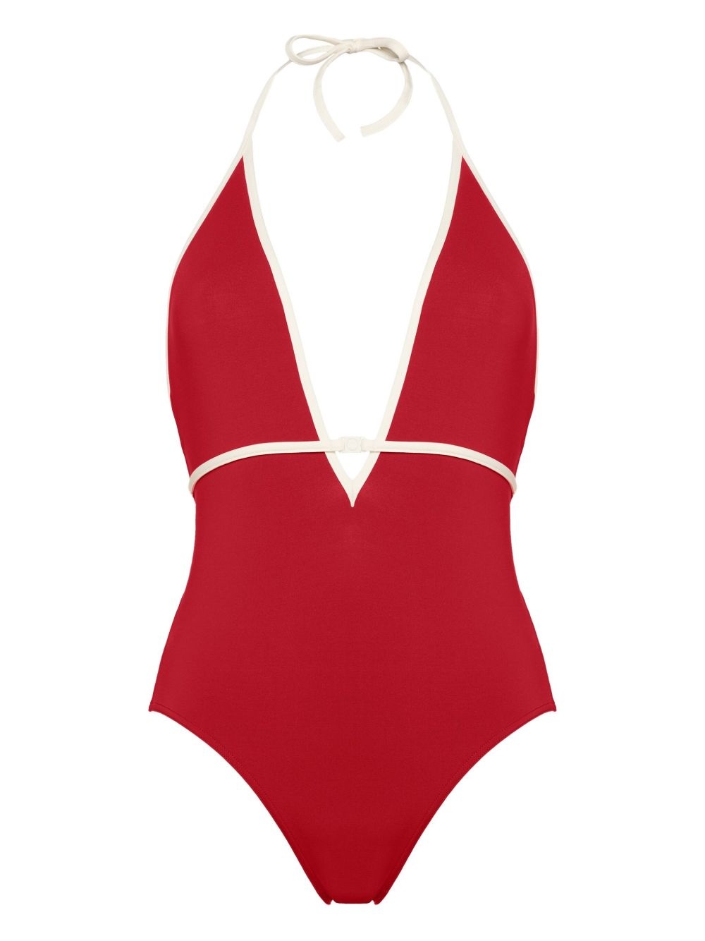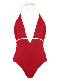 Loulou swimsuit Highlights - Red - V-neck - Contrasting trim - Halterneck tie fastening - Be mindful to try on swimwear over your own garments. Made in Italy Composition Polyamide 77%, Spandex/Elastane 23% SIZE & FIT FittingInformation This piece fits small – take one size up