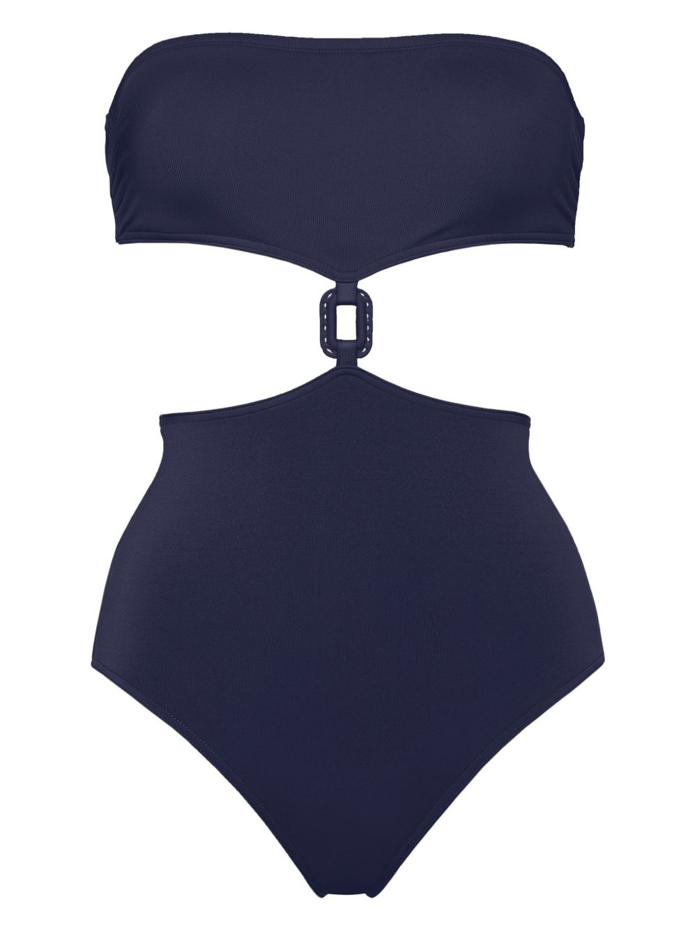 Marina swimsuit Highlights - Navy blue - Rear clasp fastening - Bustier-style neckline - Cut-out detailing - Be mindful to try on swimwear over your own garments. Made in France Composition Polyamide 77%, Spandex/Elastane 23% SIZE & FIT FittingInformation This piece fits small – take one size up