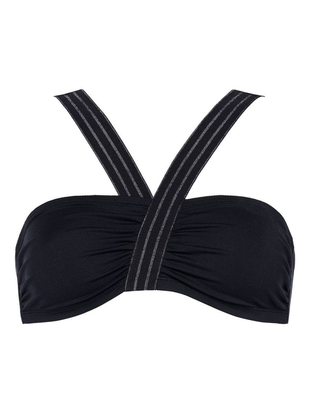 Rendez-vous cross-strap bikini top Highlights - Black - Ruched detailing - Wide cross-strap design - Structured cups - Contrasting striped accents - Be mindful to try on swimwear over your own garments. Made in Italy Composition Polyamide 77%, Spandex/Elastane 23% Washing instructions Machine Wash