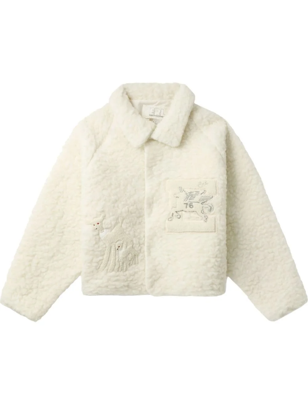 fleeced wool bomber jacket Highlights - Oatmeal beige - Wool blend - Fleece texture - Front press-stud fastening - Straight-point collar - Long raglan sleeves - Applique detailing - Applique lettering - Straight hem Made in Italy Composition Wool 60%, Polyester 40% SIZE & FIT Measurement CHEST 46.45 in(118 cm) LENGTH 21.25 in(54 cm)