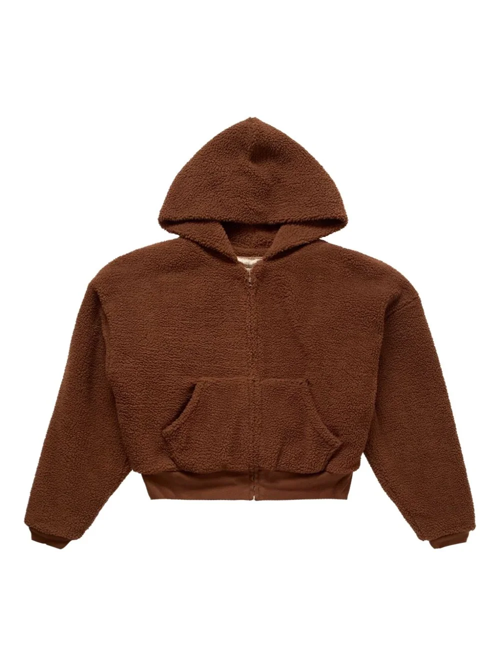fleeced zip-up hoodie Highlights - Brown - Fleeced texture - Zip fastening - Kangaroo pocket - Hooded neck - Ribbed cuffs Imported Composition Cotton 100% Washing instructions Read Manufacturer Guidelines