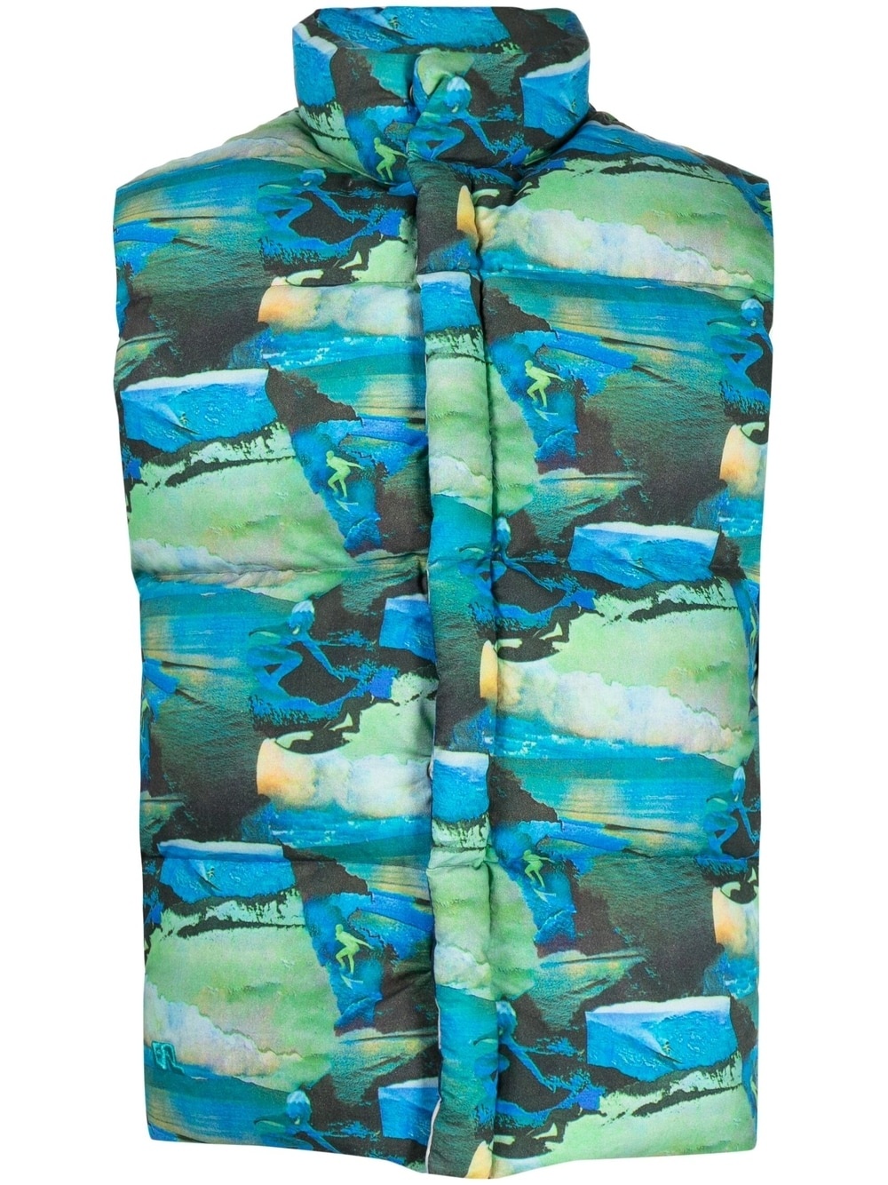 printed quilted puffer gilet blue/green cotton quilted all-over graphic print high neck sleeveless concealed front press-stud fastening straight hem When buying this unisex item, keep in mind that it is graded in standard men's sizing. Imported Composition Cotton 100%