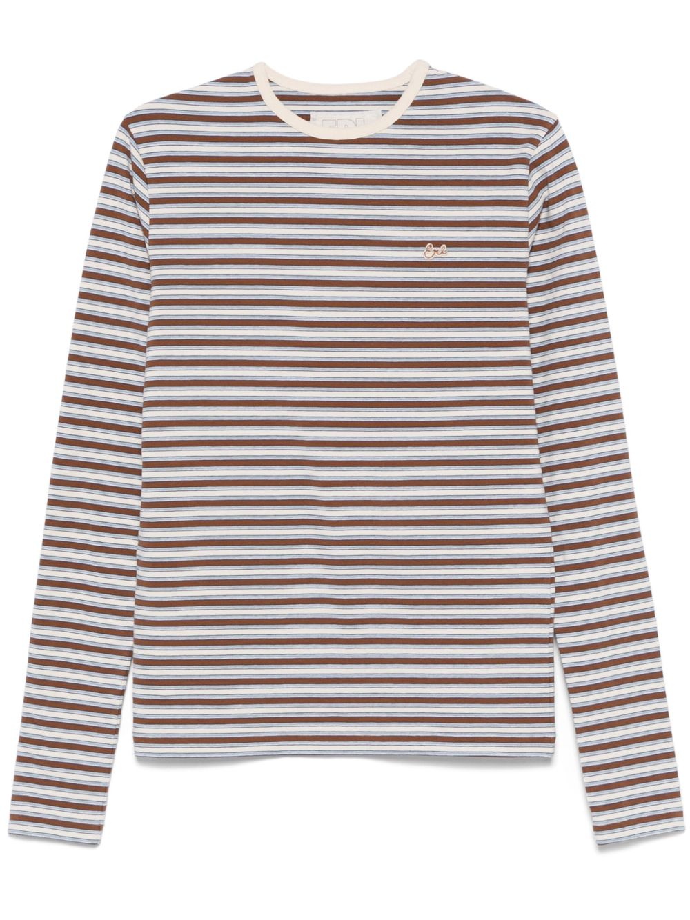 striped T-shirt Highlights - Chocolate brown - Logo patch at the chest - Crew neck - Long sleeves Imported Composition Cotton 95%, Elastane 5% SIZE & FIT Model measurements Height 6 ft 2 in(1.89 m) Bust/Chest 35.03 in(89 cm) Hips 38.18 in(97 cm) Waist 29.92 in(76 cm) FittingInformation Designed for a slim fit, offering a comfortable fit that sits just away from the body Made from a midweight stretch fabric, this piece offers elasticity and flexibility when worn Washing instructions Machine Wash