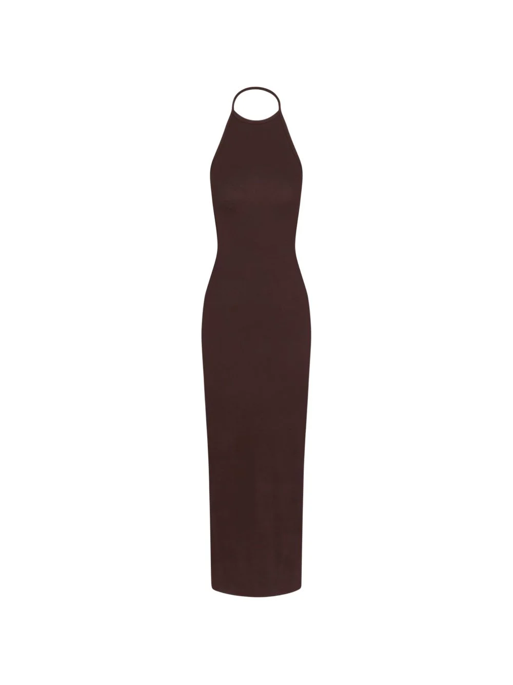 halterneck maxi dress Highlights - Brown - Halterneck - Round neck - Sleeveless - Maxi length - Back slit Imported Composition Modal 96%, Spandex/Elastane 4% Washing instructions Read Manufacturer Guidelines