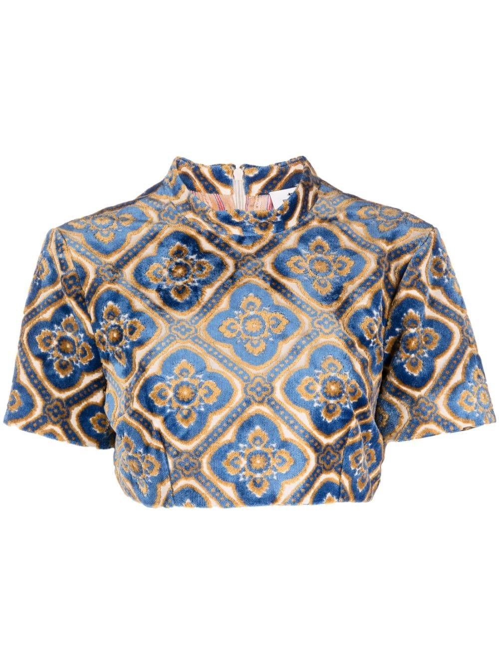 abstract-print velvet crop top Highlights - Blue/multicolour - Velvet finish - Abstract pattern print - Mock neck - Short sleeves - Rear zip fastening - Straight hem - Cropped Made in Italy Composition Outer: Viscose 53%, Cotton 47% Lining: Viscose 52%, Acetate 48% SIZE & FIT Model measurements Height 5 ft 10 in(1.78 m) Bust/Chest 32.67 in(83 cm) Hips 35.43 in(90 cm) Waist 23.22 in(59 cm) FittingInformation Designed for a slim fit that sits just away from the body offering a close yet comfortable fit Cropped in length Made from a midweight non-stretch fabric This piece fits true to size – take your usual size Washing instructions Dry Clean Only